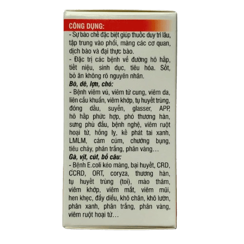 - Đặc trị các bệnh về đường hô hấp, tiết niệu, sinh dục, tiêu hóa. Sốt, bỏ ăn không rõ nguyên nhân.